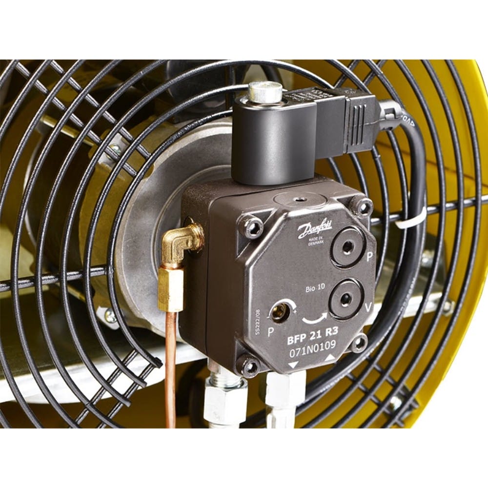 Тепловая дизельная пушка непрямого нагрева Ballu BHDN-30 серии Tundra – это мощный теплогенератор, применяемый для обогрева жилых и нежилых помещений, либо для локального прогрева рабочих поверхностей. Воздух из помещения при помощи вентилятора, расположенного в основании пушки втягивается внутрь корпуса и, частично попадая в горелку теплообменника, который является камерой сгорания, смешивается с распылённым форсункой дизельным топливом, образуя воздушно-топливную смесь, которая автоматически поджигается посредством 12kV электродов. Нагретый воздух вместе с продуктами сгорания, пройдя через теплообменник- выбрасывается наружу из дымохода, расположенного в верхней части корпуса пушки. Весь остальной объём воздуха, обтекая теплообменник нагревается и выбрасывается в обогреваемое помещение, не смешиваясь с продуктами сгорания.