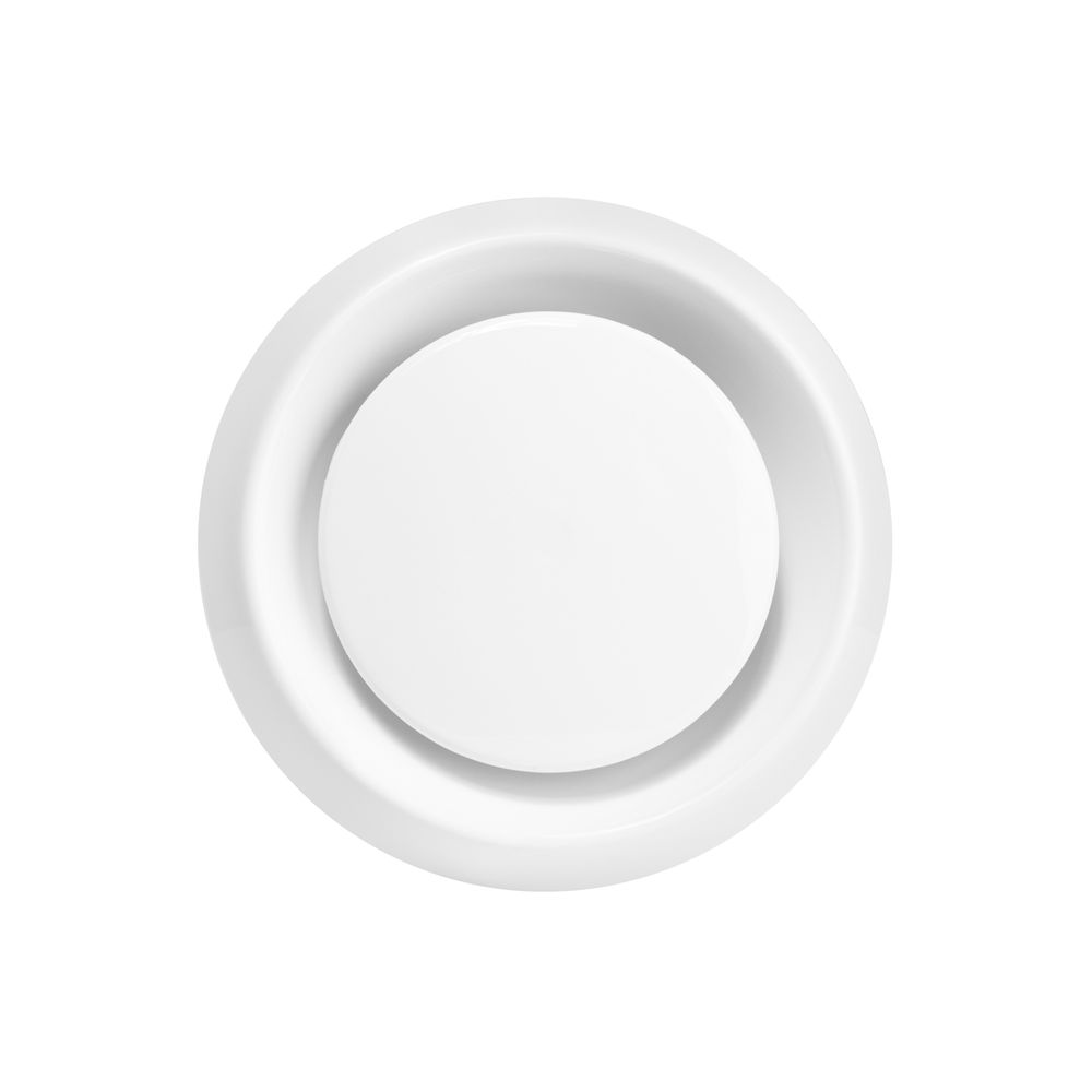 Диффузор оснащён центральным диском, который позволяет плавно регулировать расход воздуха путём его вращения. Это обеспечивает точную настройку системы вентиляции в зависимости от потребностей помещения. Для удобства монтажа в комплект входит соединительная муфта с демпфирующим кольцом, что облегчает установку и повышает герметичность соединения.
