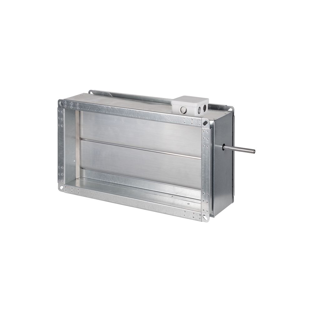 Корпус клапана выполнен из оцинкованной стали, обеспечивающей высокую коррозионную стойкость и долговечность в различных эксплуатационных условиях. Внутренние поворотные створчатые лопатки изготовлены из усиленного алюминиевого профиля и приводятся в движение системой кинематики рычагов и тяг. Параллельное открытие лопаток способствует равномерному распределению воздуха и снижению уровня шума при работе вентиляции.