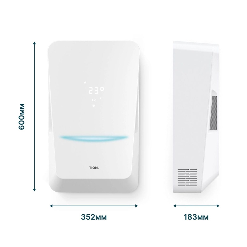 Для удобства пользователя предусмотрены различные варианты управления: с помощью пульта дистанционного управления, через мобильное приложение Tion Smart, а также с использованием голосового помощника. Устройство работает в широком диапазоне температур от -40 до +50 °C, оснащено функцией рециркуляции воздуха. Корпус бризера выполнен из прочного материала с шумо- и теплоизоляцией, что обеспечивает тихую работу (уровень шума от 19 до 50 дБ) и энергоэффективность (потребляемая мощность 1,05 кВт). Габариты устройства составляют 600 × 352 × 182 мм, вес — 6,3 кг, что делает его компактным и удобным для установки в различных интерьерах.