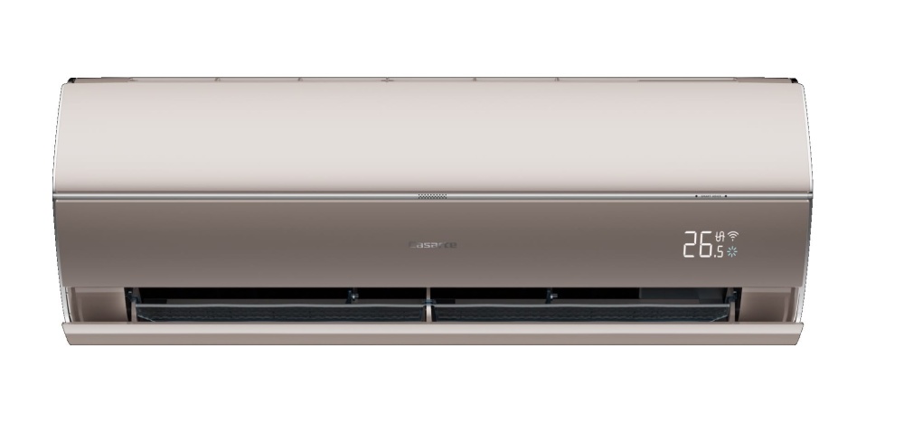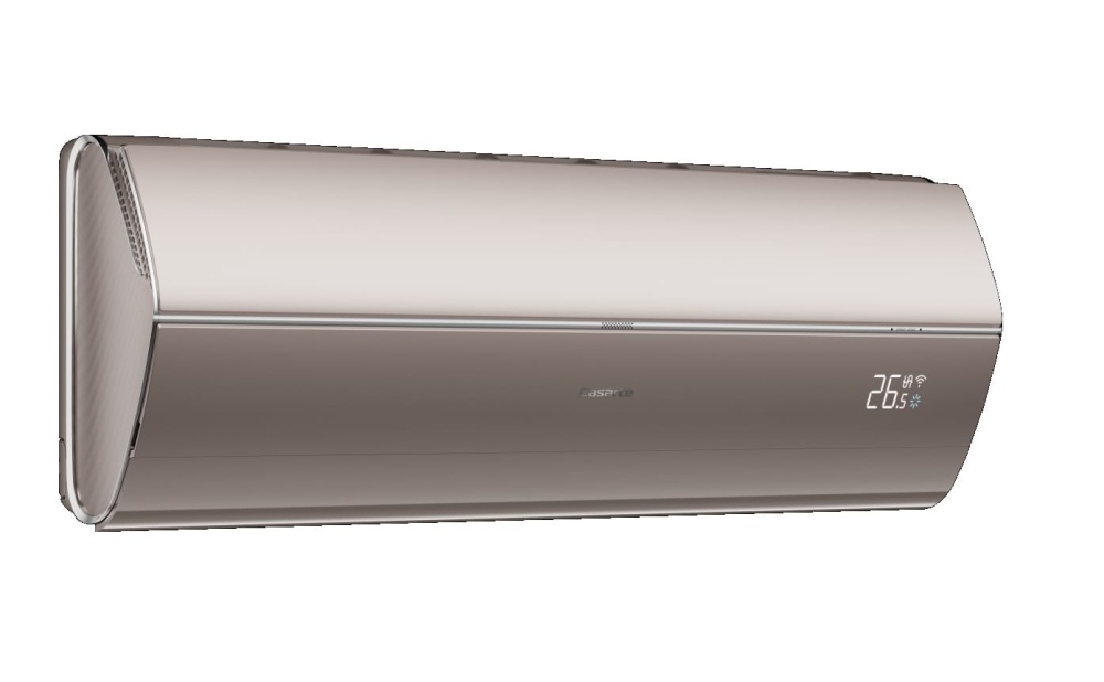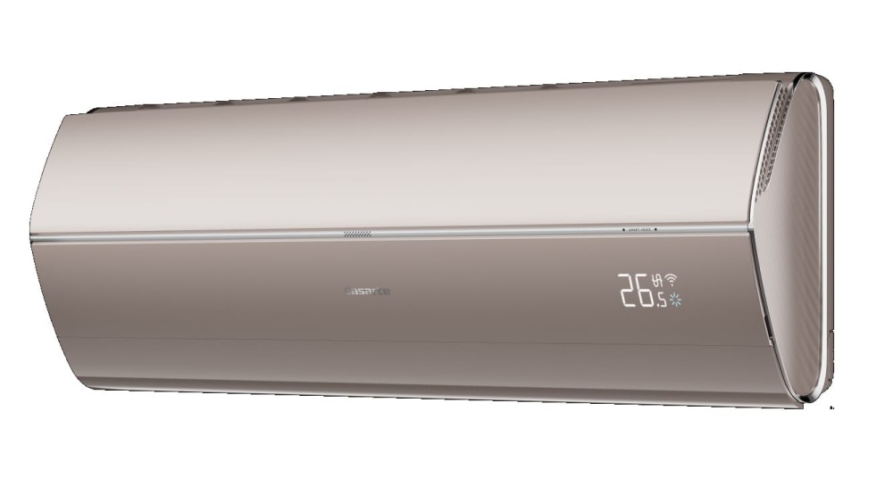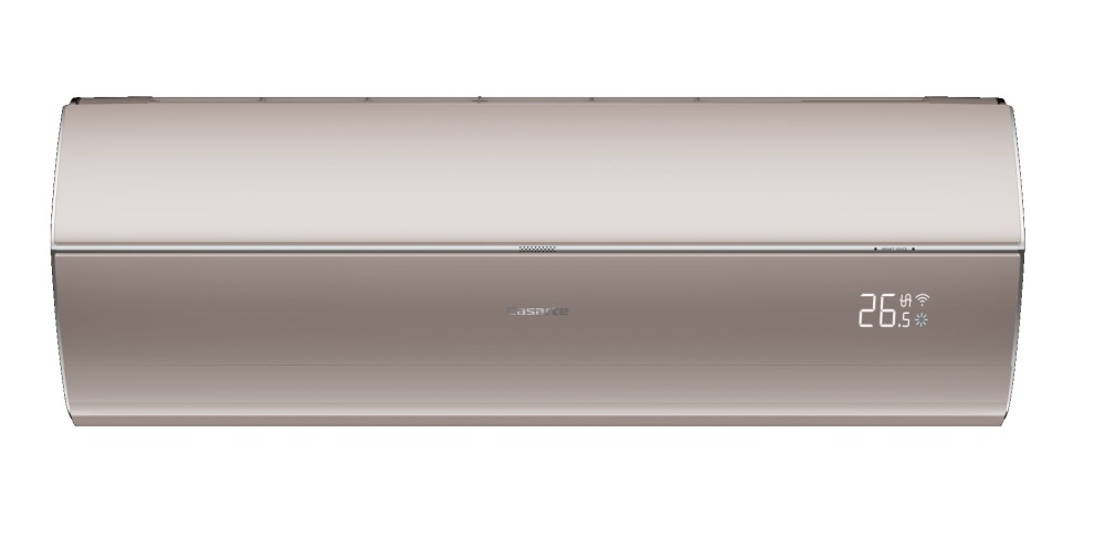 Дизайн внутреннего блока выполнен в глянцевом белом корпусе с скрытым LED-дисплеем, гармонично вписываясь в современный интерьер.