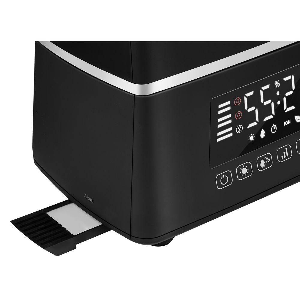 Устройство оснащено трёхрежимным увлажнением, функциональным гигростатом и электронным управлением с LED‑дисплеем, информирующим об уровне влажности, температуре и времени работы таймера. Система защиты обеспечивает автоматическое отключение при низком уровне воды и при опрокидывании, дополнена защитой кнопок от детей. Сенсорная панель совмещена с эргономичным пультом дистанционного управления, а корпус с софт‑тач покрытием и двухуровневой мягкой подсветкой придаёт прибору эстетичность и делает его своеобразным ночным светильником.