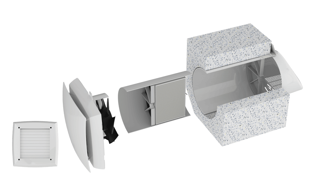 Модель оборудована трехскоростным бесшумным EC-электродвигателем, который обеспечивает производительность воздуха в диапазоне 30, 45 и 70 м³/ч при уровне шума от 11 до 36 дБА в зависимости от выбранной скорости. Для очистки воздуха предусмотрена двухступенчатая система фильтрации: стандартный фильтр грубой очистки G3 и опциональный фильтр тонкой очистки F7, что позволяет снизить содержание пыли и аллергенов в приточном воздухе. Автоматическая заслонка-жалюзи предотвращает обратный поток воздуха при выключении устройства.