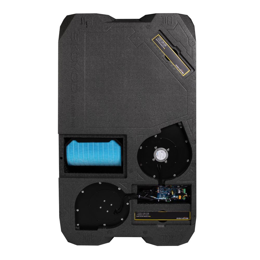 Корпус устройства выполнен из вспененного полипропилена (EPP) авиационного класса с антимикробными и антистатическими добавками, обеспечивающими высокие звуко- и теплоизоляционные свойства при сохранении прочности. Установка оборудована бесколлекторными EC-вентиляторами от EBMpapst с электронным управлением и встроенной термозащитой, что гарантирует надежную и бесшумную работу. Для очистки воздуха применён U-образный HEPA-фильтр с отрицательно заряженными ионами, эффективно удаляющий пыль, микробы и летучие органические соединения.