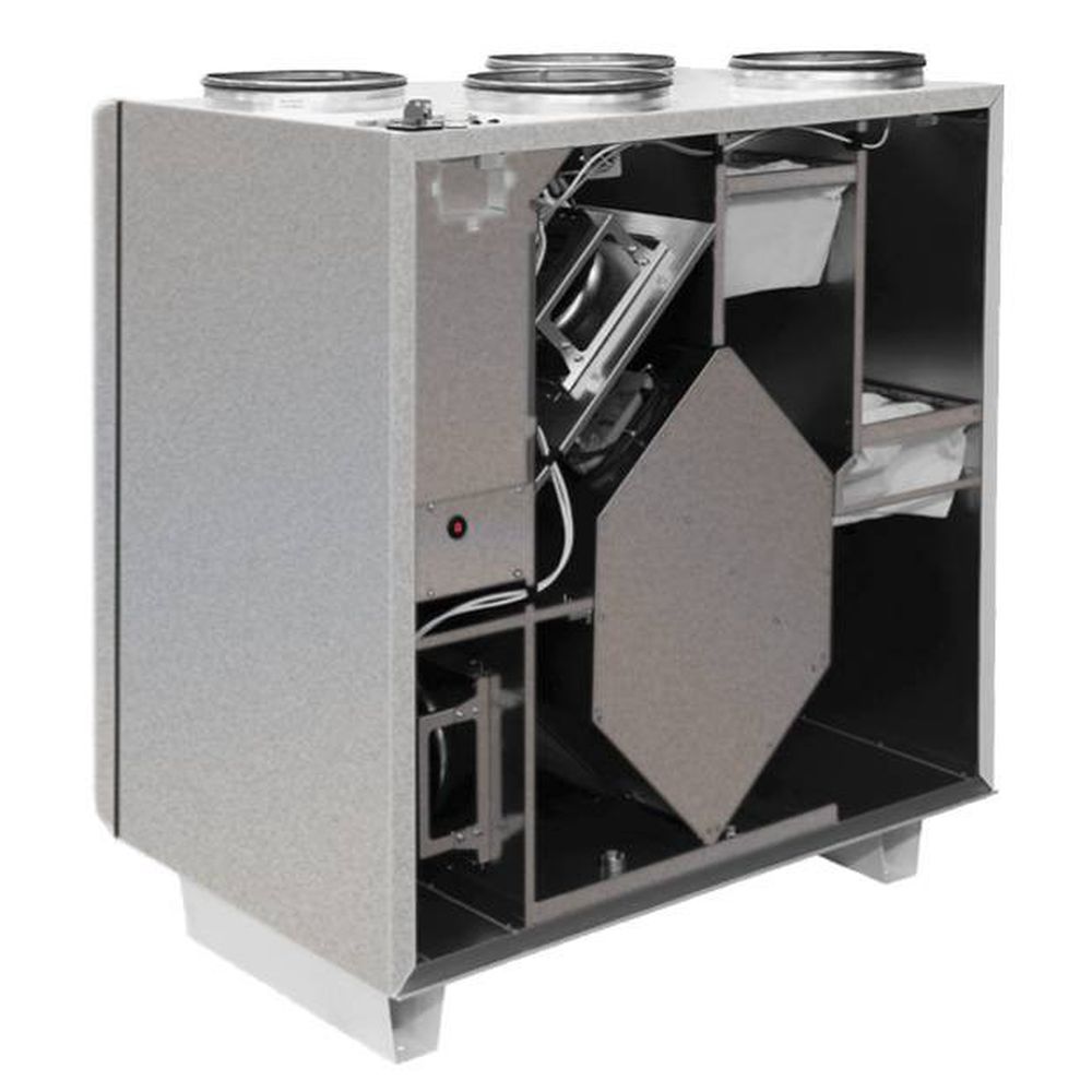 Габариты устройства составляют примерно 845×950×462 мм, вес — около 82 кг. Монтаж осуществляется в вертикальном положении с подключением к круглым воздуховодам диаметром 250 мм. Установка рассчитана на работу в диапазоне наружных температур от -30 до +50 °C, что делает её универсальным и энергоэффективным решением для создания комфортного микроклимата в помещениях средней площади.