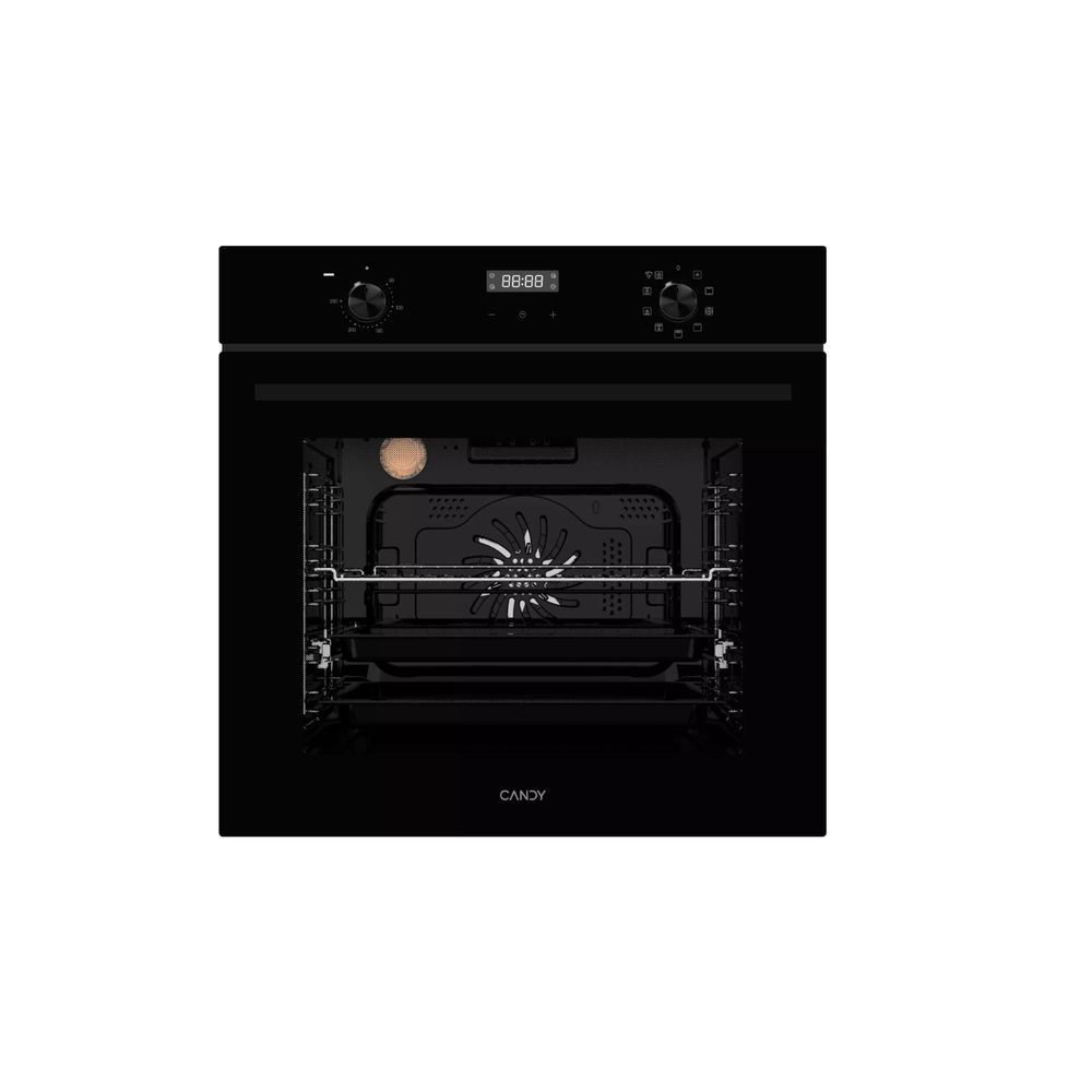 Чёрный электрический духовой шкаф Candy COXP08LTBB на 78 литров. Этот духовой шкаф имеет стеклянную панель управления с поворотным регулятором мощности, сенсорными кнопками и дисплеем с часами. На дисплее также отображаются часы. Модель поддерживает 9 режимов работы, включая режимы с температурой от 50 °C до 250 °C. Вентилятор охлаждения дверцы помогает избежать нагревания окружающей мебели. Функция паровой очистки упрощает процесс ухода за камерой. Candy COXP08LTBB оснащён грилем и конвекцией, что делает его удобным для приготовления различных блюд. Галогенная лампа обеспечивает яркое освещение внутри камеры. Вы можете контролировать процесс готовки с помощью независимого таймера или таймера с функцией автоотключения. Телескопические направляющие позволяют легко и аккуратно вытаскивать противень с готовым блюдом.