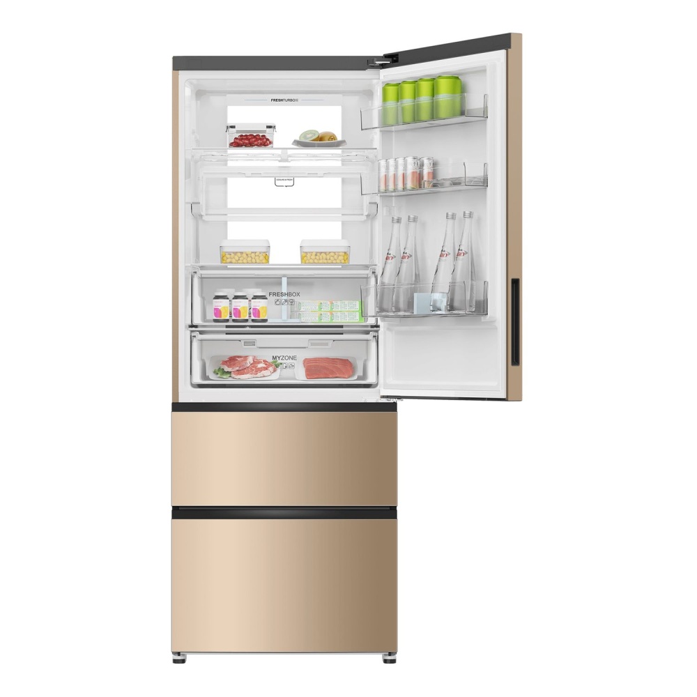 HAIER A4F742CGGU1 — элегантный современный холодильник сдержанного золотистого цвета, который станет украшением кухни. Его ширина — 70 см, что делает холодильник весьма вместительным и подходящим для больших семей или для тех, кто любит готовить и хранит одновременно много продуктов. Объём холодильного отделения — 277 л. Многопоточное охлаждение обеспечивает качественное поддержание температуры на всех уровнях отделения, благодаря постоянной циркуляции холодного воздуха. В контейнере 0º Zone (40 л) отлично сохраняется охлаждённое мясо, рыба, морепродукты, мясные и молочные деликатесы — температура здесь около 0 градусов и доступны настройки влажности. В зоне свежести для овощей и фруктов FreshBox специальная респираторная мембрана HCS в крышке контейнера автоматически поддерживает оптимальную влажность — около 90%. Складная стеклянная полка и двойная металлическая полка для напитков дают возможность вариативно подойти к организации пространства в холодильнике. Современное светодиодное