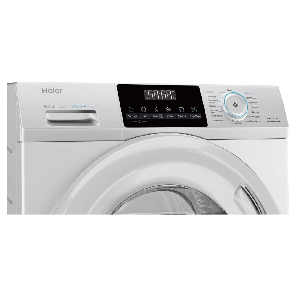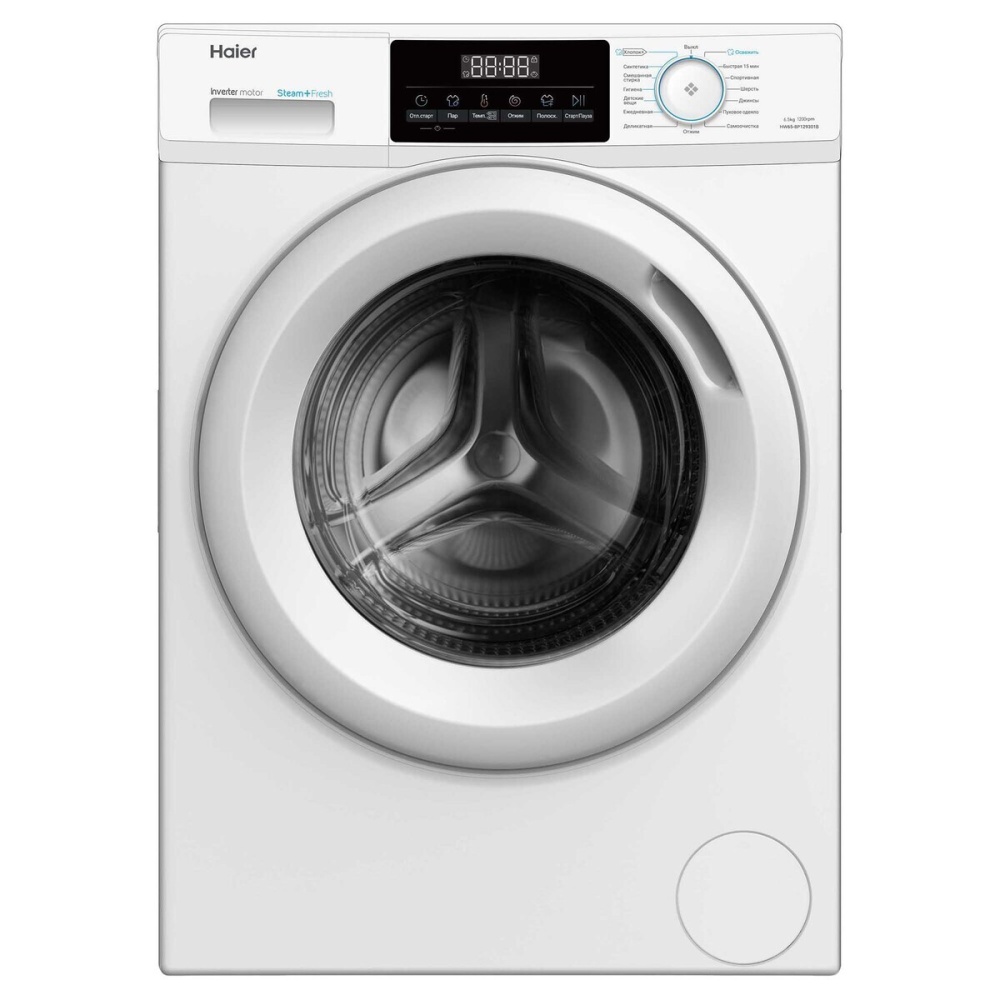 Стиральная машина Haier HW65-BP129301B вмещает до 6,5 кг белья и предлагает 15 различных программ стирки. Информация о текущем цикле отображается на дисплее, а управление режимами, температурой и скоростью отжима осуществляется с помощью сенсорных кнопок и поворотных рычагов. Модель включает программы обработки паром, дополнительного полоскания и стирки различных типов тканей, включая пуховые одеяла. Также доступна функция самодиагностики, возможность отсрочки запуска до 24 часов и блокировка управления для защиты от детей.