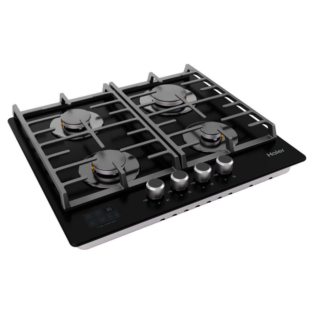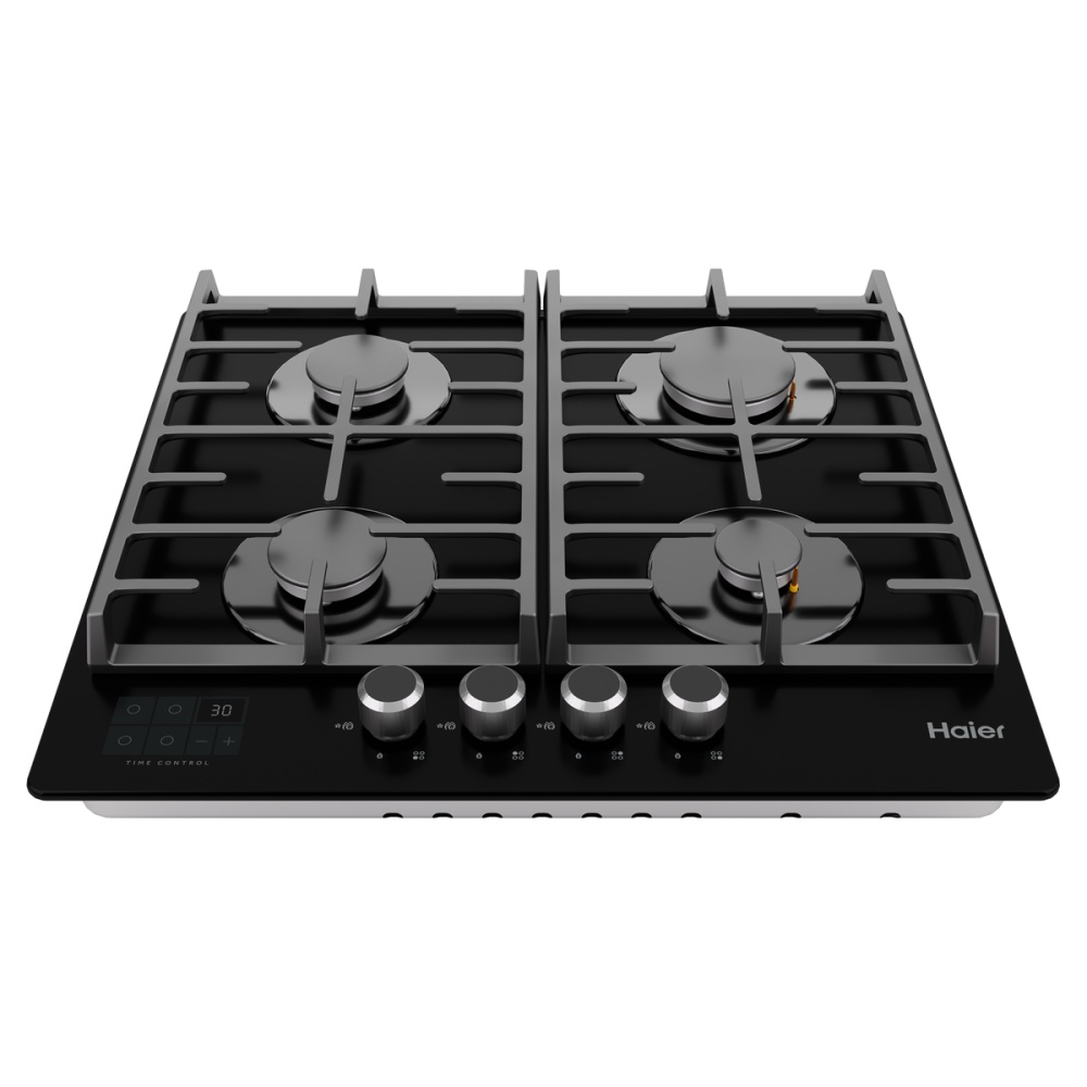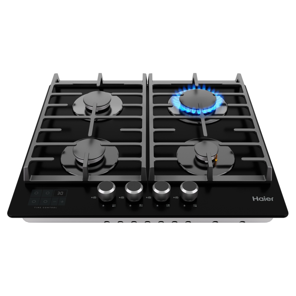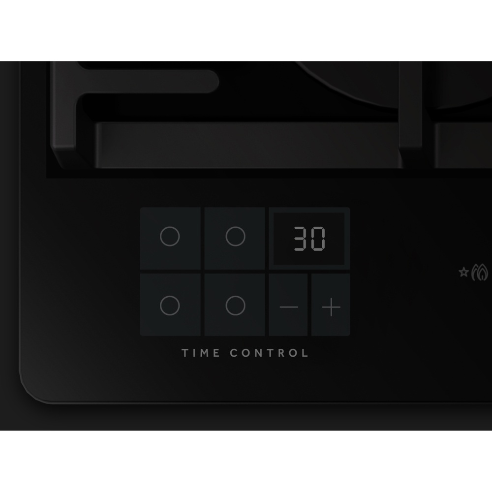 Газ на стекле, электронный таймер с сенсорным управлением выключения всех конфорок, чугунные решетки, электроподжиг, Черное стекло