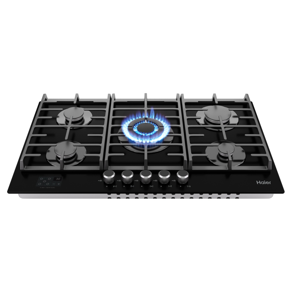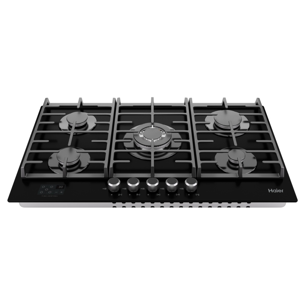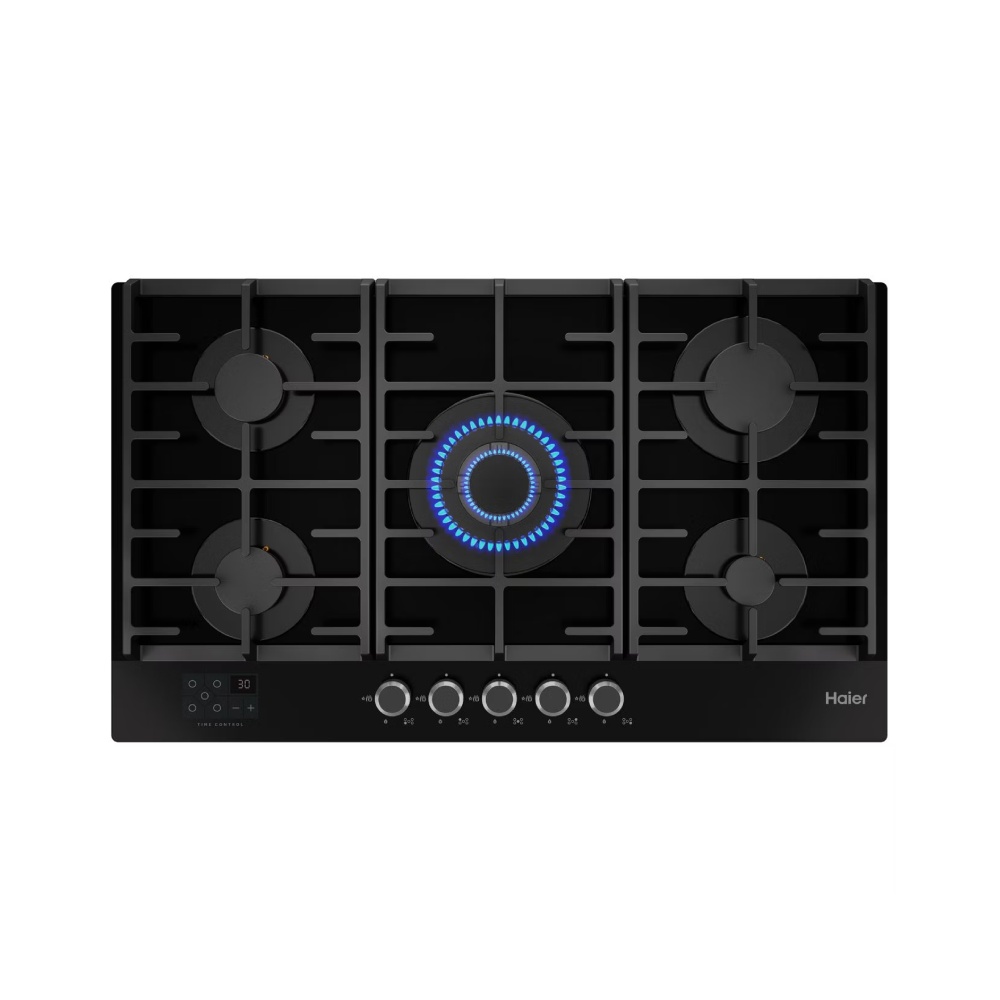 Газ на стекле, ширина 86 см, 5 конфорок, электронный таймер с сенсорным управлением выключения всех конфорок, Wok конфорка, чугунные решетки, электроподжиг, Черное стекло