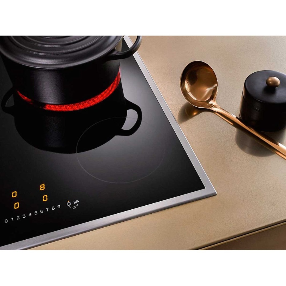 Miele KM 6520 FR — электрическая варочная панель. Имеет 4 конфорки разной мощности, одна из которых двухконтурная. Функция автоматики закипания увеличивает мощность, а затем снижает ее для предотвращения подгорания. Опция восстановления параметров сохраняет настройки, если вы случайно выключили прибор. Защита от перегрева и трехступенчатый индикатор остаточного тепла сделают эксплуатацию полностью безопасной. Варочная поверхность шириной 57 см, выполненная из практичной и долговечной стеклокерамики черного цвета, устанавливается на столешницу сверху. Для очистки ее достаточно просто протереть, при более сильных загрязнениях можно воспользоваться специальным скребком. Широкая рамка из нержавеющей стали предохранит кухонную мебель от пролитой жидкости. Остаточное тепло позволяет отключить нагрев на последнем этапе приготовления, тем самым экономя электроэнергию. Интуитивно понятное сенсорное управление EasySelect позволяет выбрать напрямую одну из 9 степеней мощности нагрева. Панель управления может блокировать