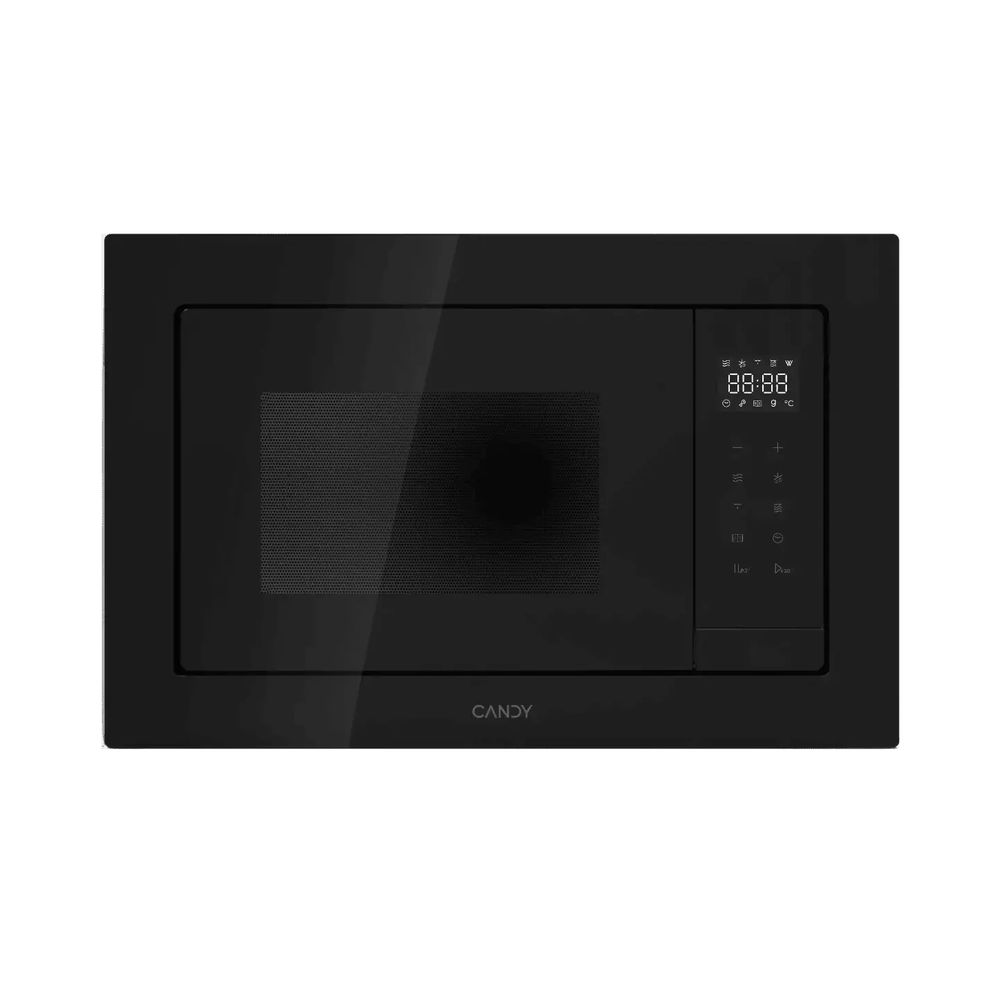 Встраиваемая микроволновая печь Candy CMXBTG218B, черная, обладает объемом 21 л. Диаметр стеклянного поворотного столика 27 см — поместится, например, средняя пицца.